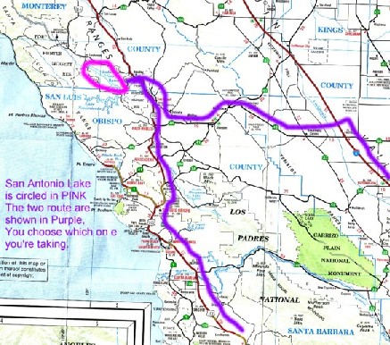 It states coming from the south you take 101, to JOLON exit and then it tells you about the turn you make on Pleyto Road (there are "north shore" signs, but I can never remember the name of that street...and the fact that it's about 40 minutes passed Paso Robles...another tid bit folks need to know...otherwise when looking on a map, you think NACI and SA lakes are right next to each other, they are, but there are HILLS in the way of a quick trip between the two.
