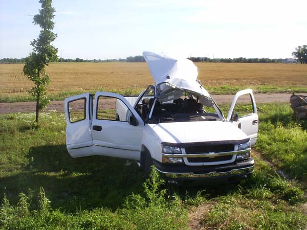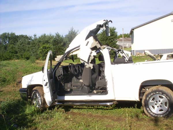 A kid in Lindsborg, KS had filled several balloons with acetylene and was shooting them with roman candles. We heard them go off about every 30 minutes or so. Then during the Lindsborg fireworks display at the college we heard the ambulances racing over towards my house. On the way home we saw all of the firemen & police at a house behind Viking Motorcycle company. Later I learned that the kid was Loren Dauer, son of Ron & Mae Dauer. I guess he had about 3 or 4 balloons left in the backseat of the truck, and when he reached in to pull one of them out he slid it just enough to cause static & BOOOOOOM!!!!!! He spent a little time in ICU in Wichita, but is at home now. He blew out both eardrums, had to have a lot of shards of glass pulled from his torso, face, & eyeballs. His nephew was either in the truck or close enough by that it blew part of his face off & required 30 some stitches to get it back. You see the damage to the truck, but the garage it was by was moved partly off of its foundation, and the people sitting in their lawn chairs watching this activity were jolted several feet backwards out of their chairs. Why he is still alive I don't know. You probably will say that was freakin' stupid, but think back on how many times you've done stupid things & lived to tell about it. I hear he is doing as good as can be expected. I hope maybe he learned a lesson. God Speed Loren!! These pictures tell the real story!