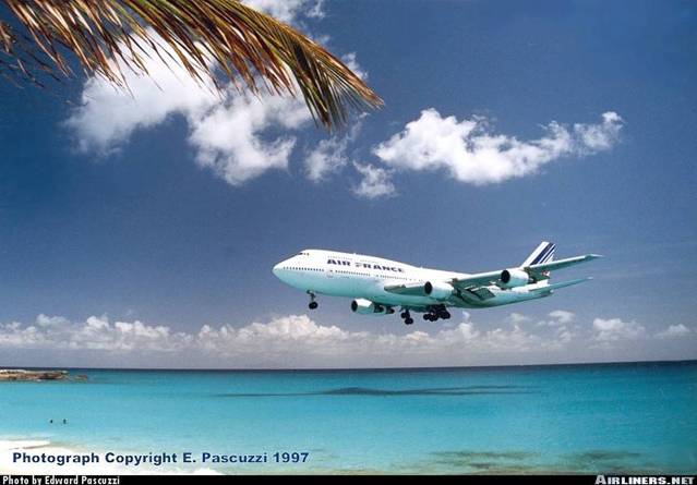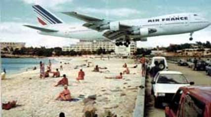 St. Maarten in the Caribean.  The runway ends at the beach.  There is a bar right the side of the approach path where you can sip frozen rum drinks and watch the heavy's come and go...  :good