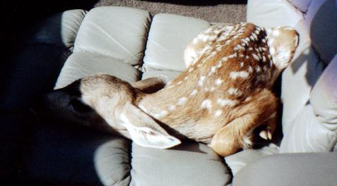 Mark saw this lil' feller run out! in front of a car, thought it was a lost baby goat. Stopped to get it, and WOW. A real Albino Whitetail Deer. Just hours old, but doing fine. No Moma deer around. Another car nearly hit it in front of Mark...