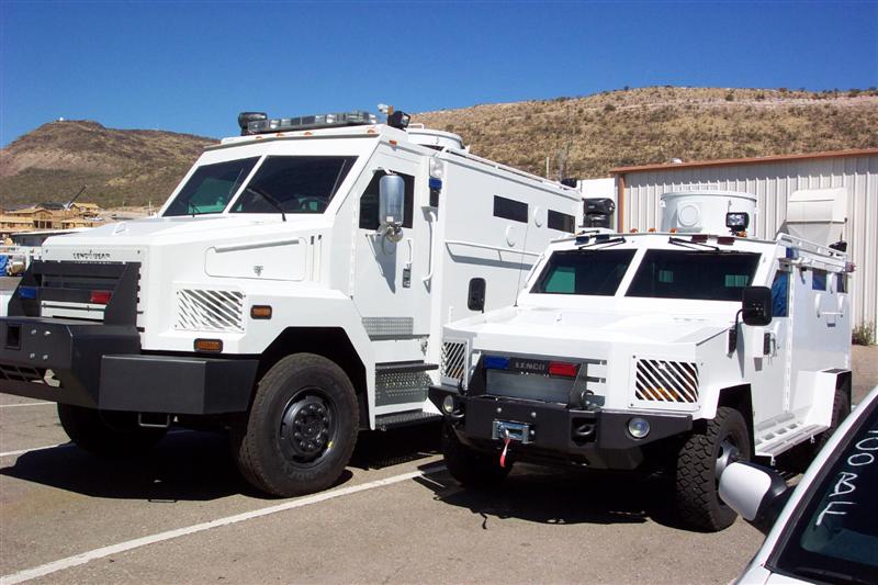 Lenco Swat Vehicles, the big one is built on a Freightliner chassis. Their made completely pretty much out of 1/2" steel, able to withstand RPG attacks, land mines, gas attacks Â