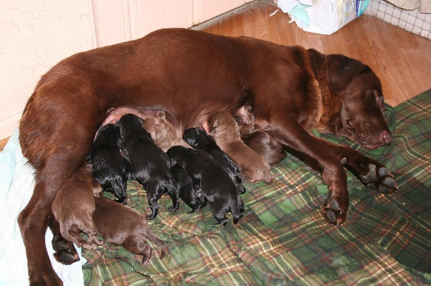 | Quote (My Man's Sportin' Wood @ Nov. 04 2007,12:22 pm) | Pups came early this morning.  First one was around 2 am  Both momma and I are exhausted.  10 pups. 5 black, 5 chocolate. 2 boys 8 girls.  Hopefully she's done.  I don't want to have to feed 'em formula every 2 hours.